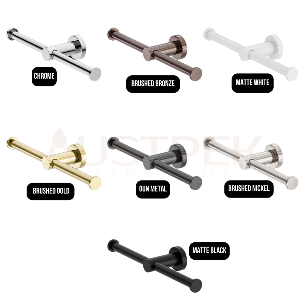 Introducing the Nero Mecca Double Toilet Roll Holder in luxurious Brushed Bronze. This essential bathroom accessory, constructed from high-grade 304 stainless steel, ensures durability and elegance. Available in a variety of finishes including brushed nickel, brushed gold, chrome, matte black, gunmetal and matte white, it's designed to complement any bathroom decor. Enjoy a 10-year replacement warranty on all finishes, combining style with peace of mind for your bathroom essentials.