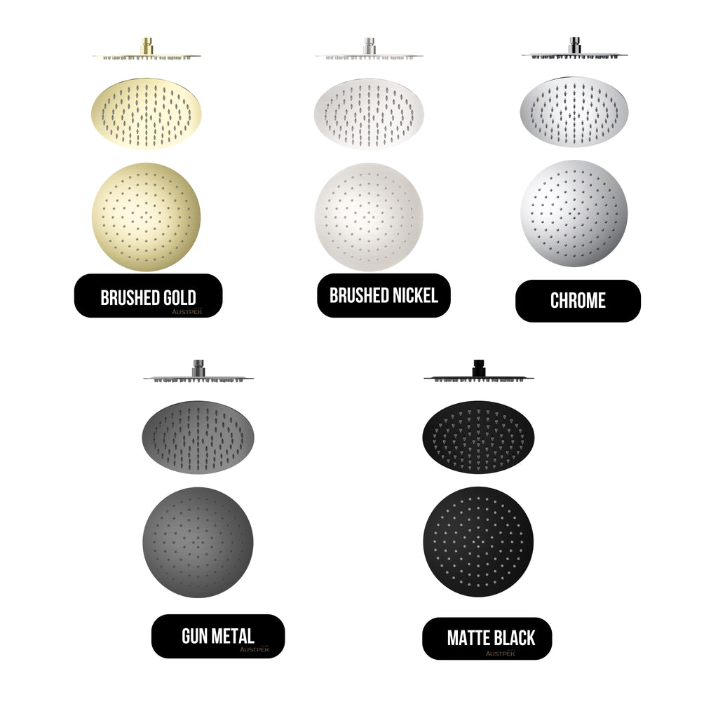 Nero Round Shower Head 250mm delivers a sleek, 5mm-thin stainless steel overhead spray with rub-clean nozzles. WELS 4 Star at 6.5 L/min and WaterMark WM-060093, it performs reliably between 150–500 kPa and 1–75°C. Designed for wall or ceiling arms, this single-function head offers easy maintenance and a minimalist look. Available in Brushed Gold, Brushed Nickel, Chrome, Gun Metal, and Matte Black. Backed by a ten-year replacement warranty plus one-year parts and labour.