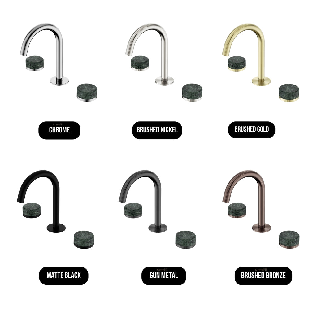 The Nero Serenity Basin Set showcases a 210mm arc spout with 180° swivel functionality and an elegant Verde Alpi marble handle. Crafted from brass and natural stone, it features a T-shaped copper connector for adjustable spacing and a ¼ turn cartridge for smooth control. WELS 5 Star rated at 5L/min, it suits both modern and luxurious bathrooms. Available in Chrome, Matte Black, Brushed Nickel, Brushed Gold, Gun Metal, and Brushed Bronze finishes and backed by a 25-year domestic and 15-year commercial warranty.