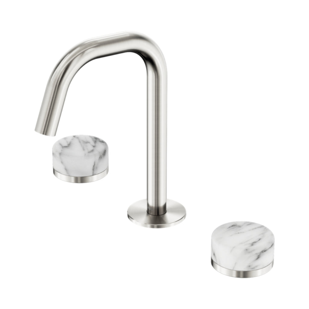 The Nero Serenity Basin Set features a 210mm edge spout with 180° swivel function and luxurious Arabescato Corchia marble handles. Built from brass with a copper connector and ¼ turn ceramic cartridge, it ensures flexible installation and smooth flow. Rated WELS 5 Star at 5L/min, it’s ideal for modern bathrooms. Available in Chrome, Matte Black, Brushed Nickel, Brushed Gold, Gun Metal, and Brushed Bronze finishes. This custom handle set is delivered within 6 weeks ETA. Backed by a 25-year domestic and 15-year commercial warranty across all finishes.