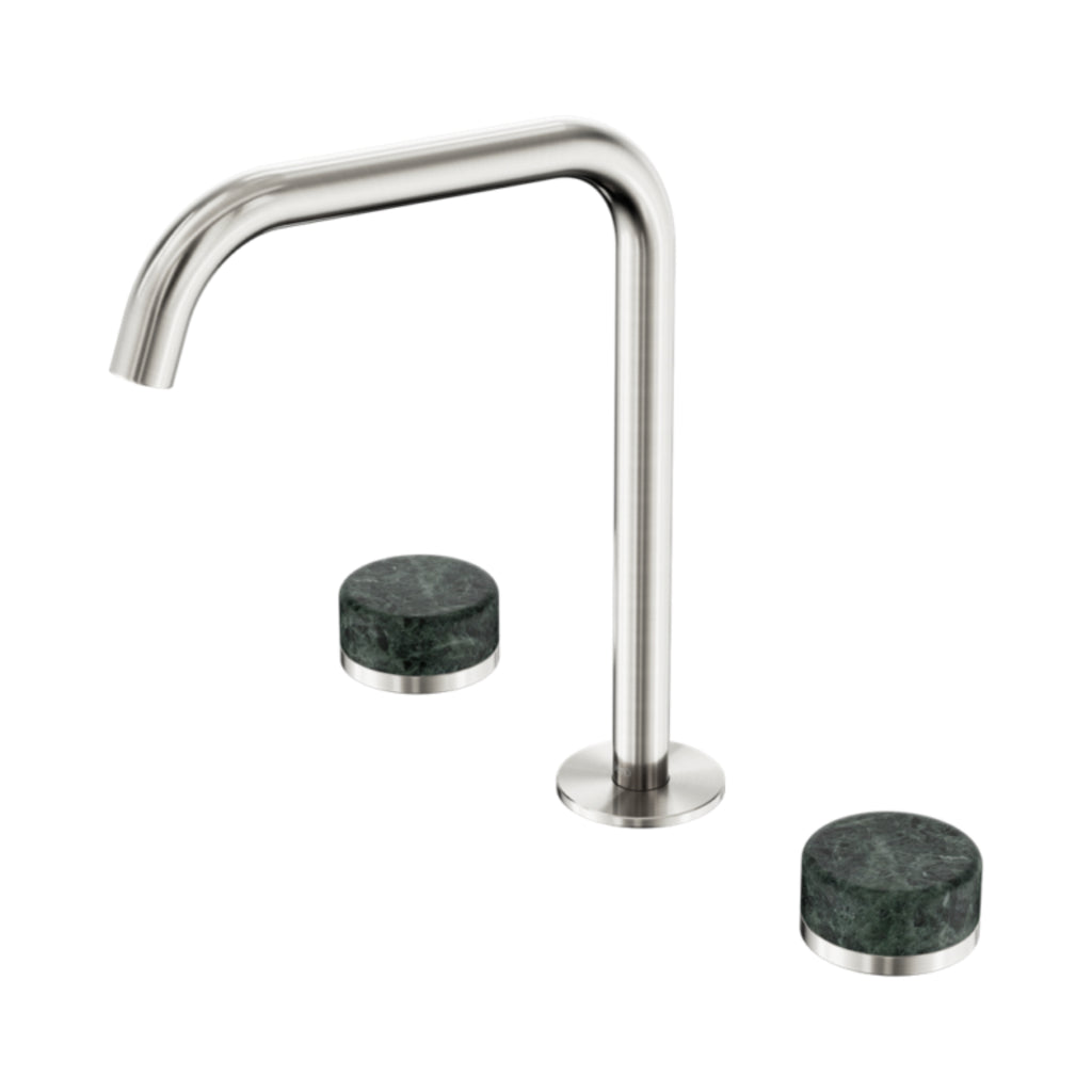 The Nero Serenity 270mm Bath/Kitchen Set in Brushed Nickel with Verde Alpi handle offers luxurious functionality and timeless style. Made from premium brass and natural marble, it features a 180° swivel spout, T-shaped copper connector, and dual aerators for bath and kitchen flexibility. Available in Brushed Bronze, Brushed Gold, Chrome, Gun Metal, Matte Black, and Brushed Nickel. Includes a full installation kit and generous residential and commercial warranties for lasting peace of mind.