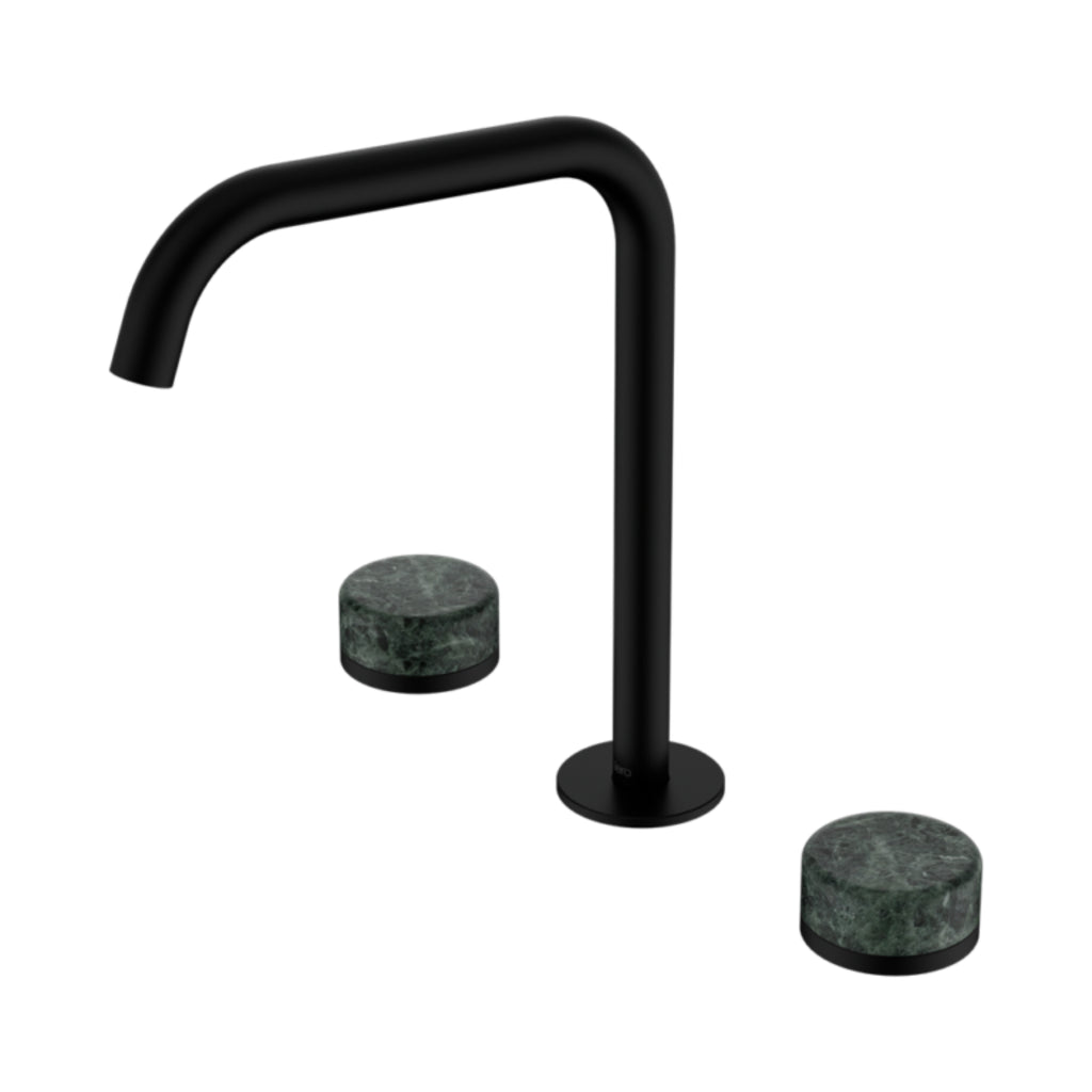 The Nero Serenity Bath/Kitchen Set with 270mm Edge Spout and Verde Alpi Handle in Matte Black delivers sleek functionality and luxurious styling. Crafted from brass and natural marble, it includes a 180° swivel spout, adjustable spacing, and dual aerators for kitchen or bath use. Available in Brushed Bronze, Brushed Gold, Brushed Nickel, Chrome, Gun Metal, and Matte Black. Backed by industry-leading warranties for enduring performance in modern interiors.