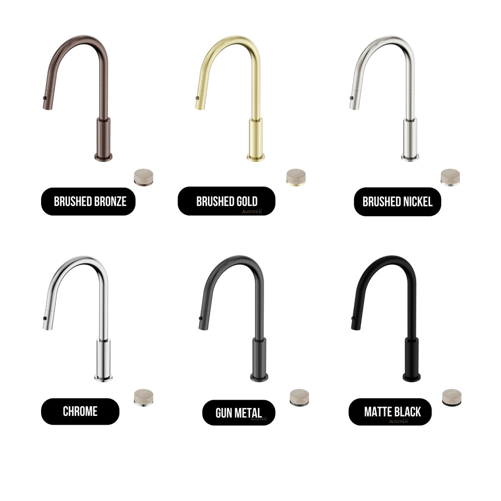 Nero Serenity Progressive Pull Out Kitchen Set With Rome Travertine Handle 433mm combines brass and natural marble to create a premium designer statement for modern kitchens. The 6 Star WELS rated set delivers 4.5 L/min with a progressive cartridge for smooth flow and precise temperature control. Lead Free construction supports safer water use, while the pull-out hand spray adds everyday convenience. Available in Brushed Bronze, Brushed Gold, Brushed Nickel, Chrome, Gun Metal and Matte Black, with extensive domestic and commercial warranties.