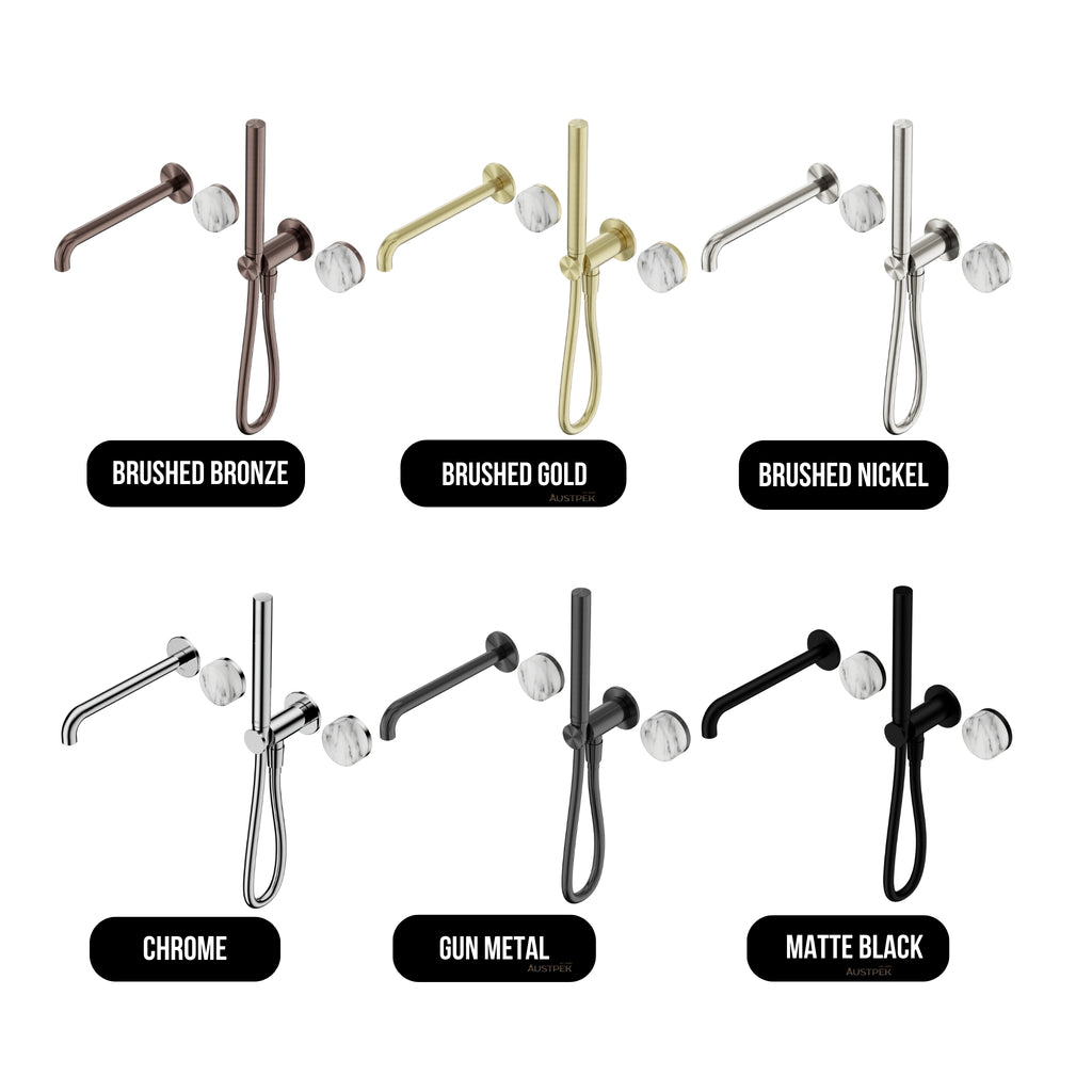 The Nero Serenity Progressive Shower System with Spout, Arabescato Corchia Handle and Slim Shower delivers refined luxury with smooth progressive temperature control and premium natural stone detailing. Featuring an integrated spout and elegant slim shower, it offers both visual sophistication and everyday practicality. Available in Brushed Bronze, Brushed Gold, Brushed Nickel, Chrome, Gun Metal and Matte Black. Supported by a comprehensive domestic warranty covering finishes, shower components and labour for lasting confidence.