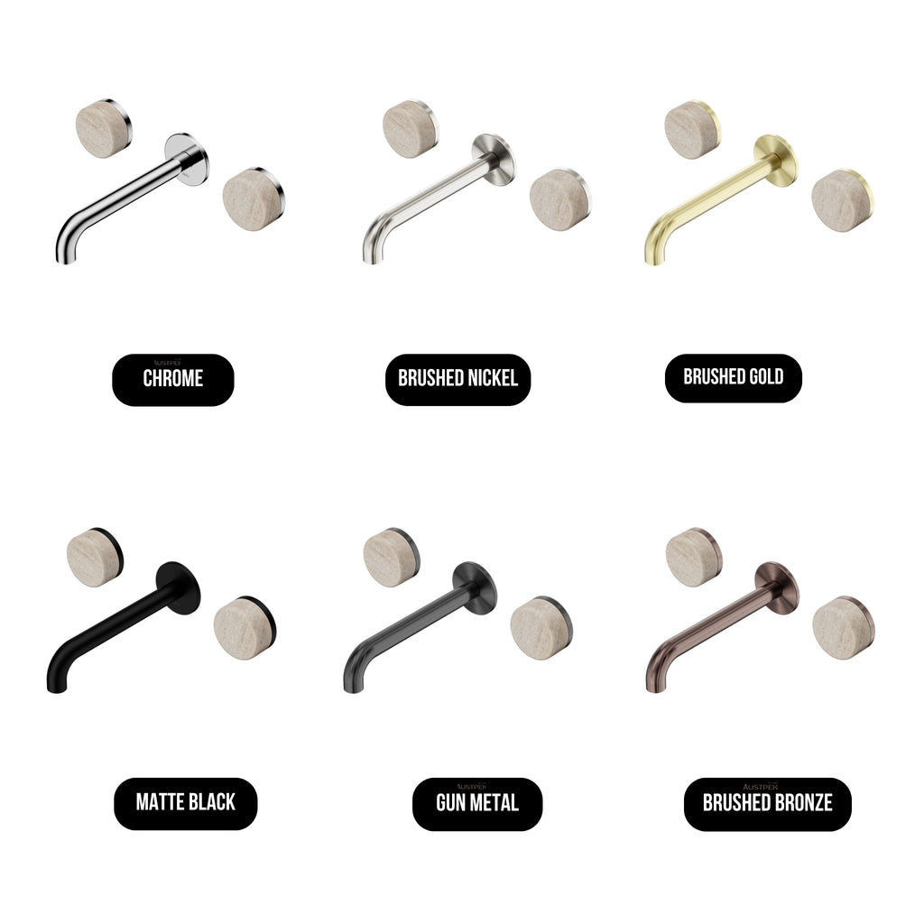 The Nero Serenity Wall Basin Set with Rome Travertine handle blends timeless natural marble with contemporary design. Available in 160mm, 185mm, and 220mm spout sizes, it features a 1/4 turn cartridge and adjustable installation for various wall thicknesses. Supplied with a non-restrictive aerator for bath use. Available in Brushed Bronze, Brushed Gold, Brushed Nickel, Chrome, Gun Metal, and Matte Black. Designed for elegance and functionality, and backed by extensive domestic and commercial warranties.