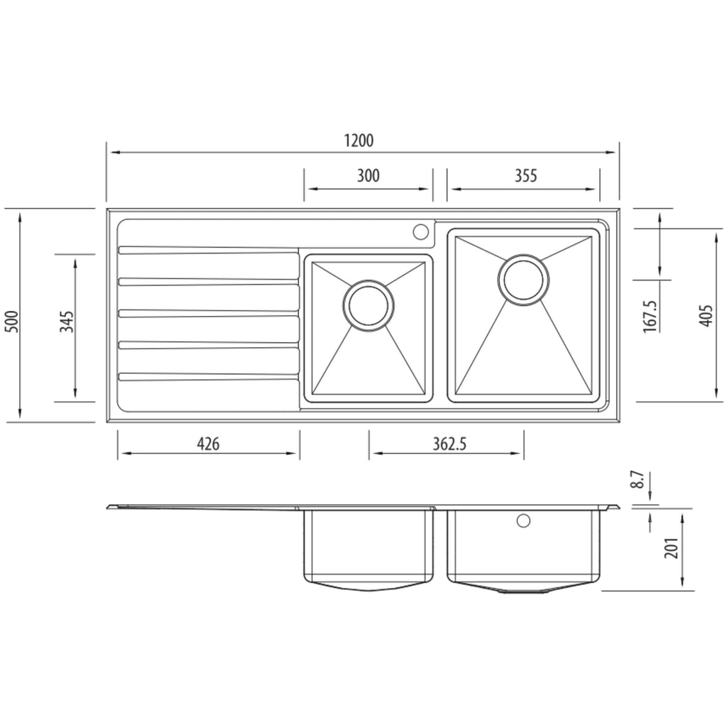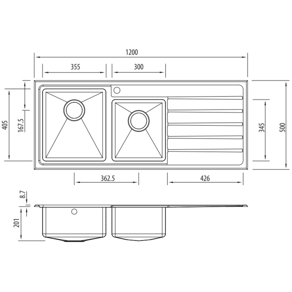 - Overall Sink Size: 1200mm X 500mm X 201mm