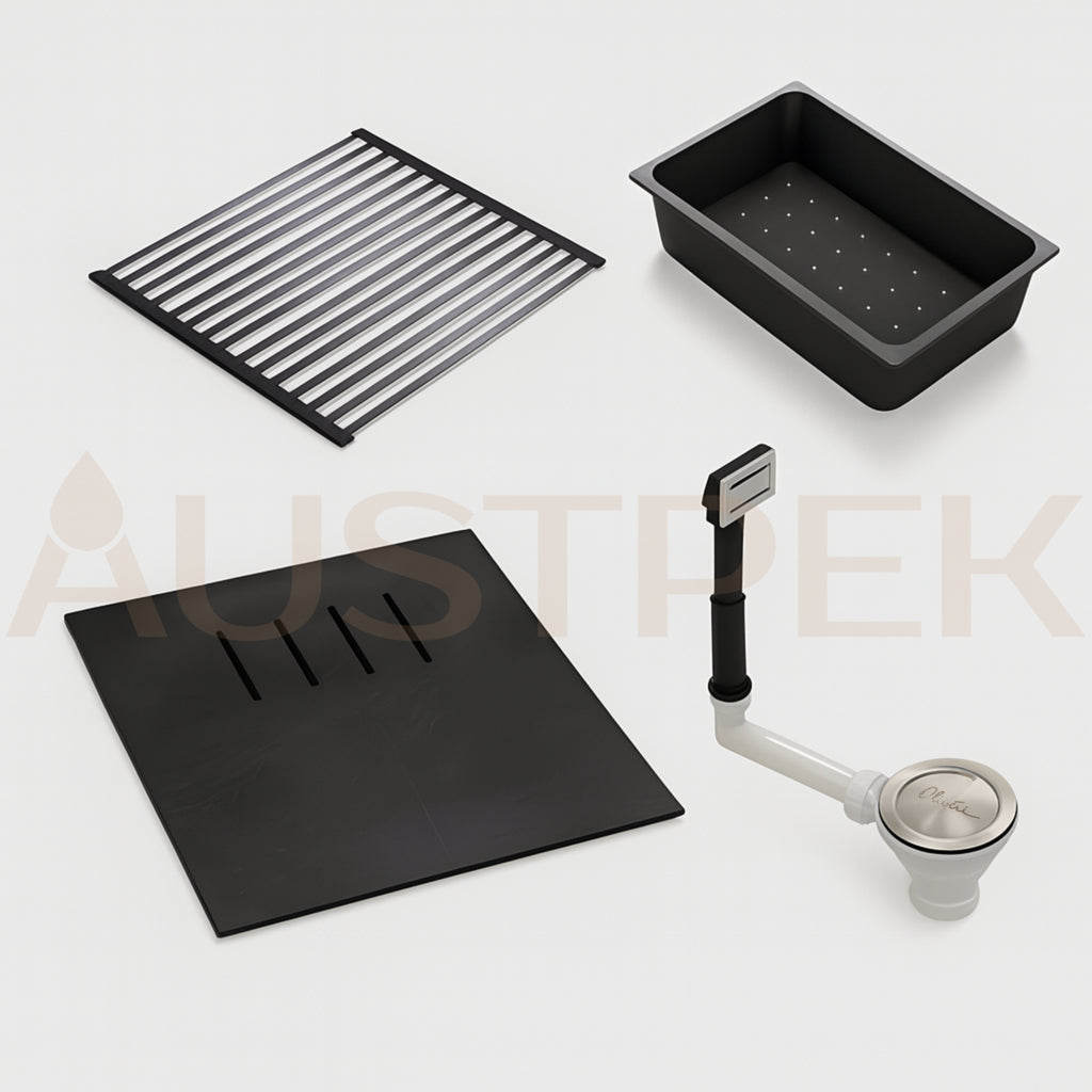- Included Accessories: 1x Covered Basket Waste with Rectangular Overflow | 1x Black Plastic Colander | 1x Black Preparation Board | 1x Black Roller Mat