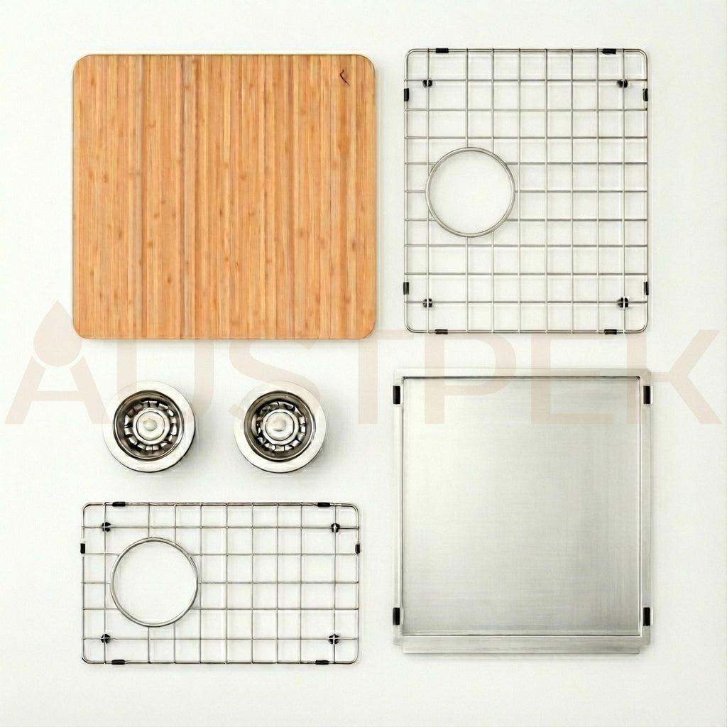 - Included Accessories: 2x Basket Waste | 2x Bowl Protector | 1x Bamboo Board | 1x Bench Top Drainer Tray