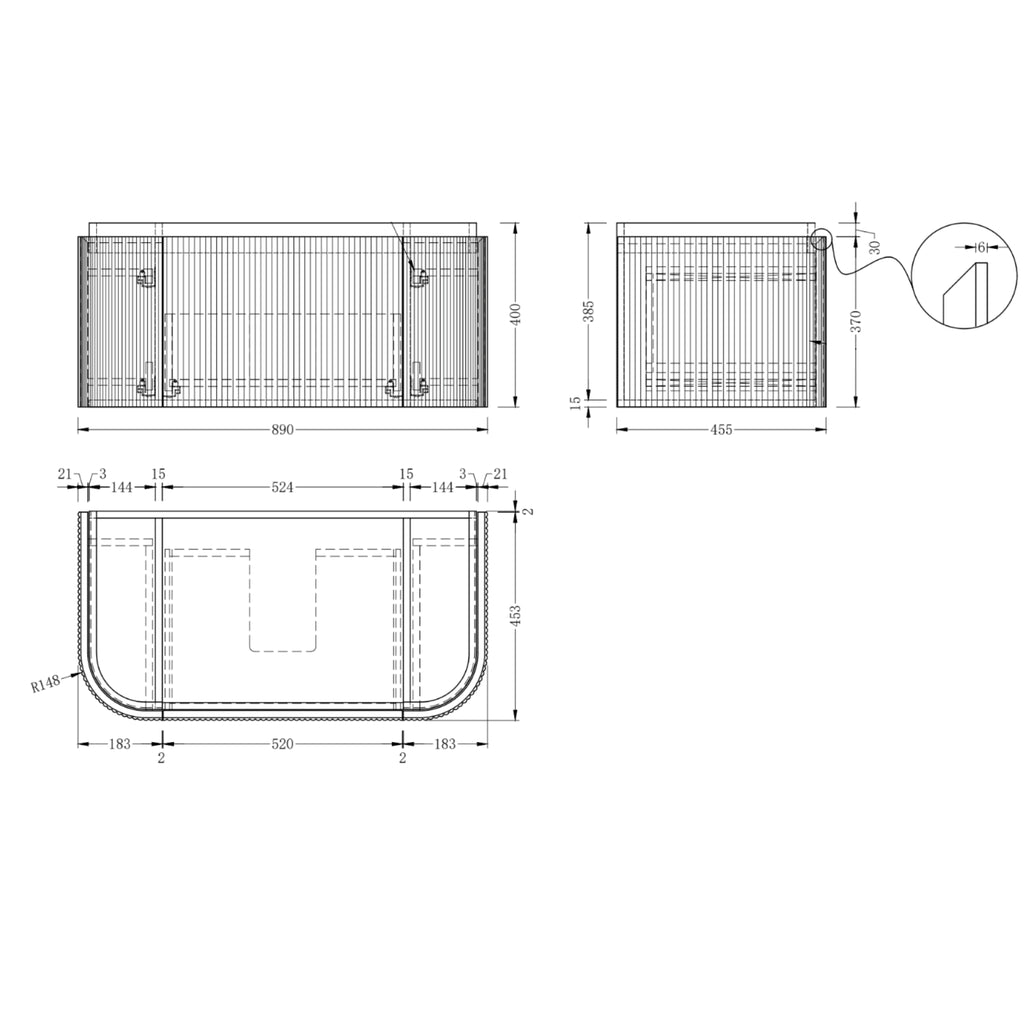 ORIO FITZROY LIGHT WALNUT FLUTED 900MM CURVE SINGLE BOWL WALL HUNG VANITY