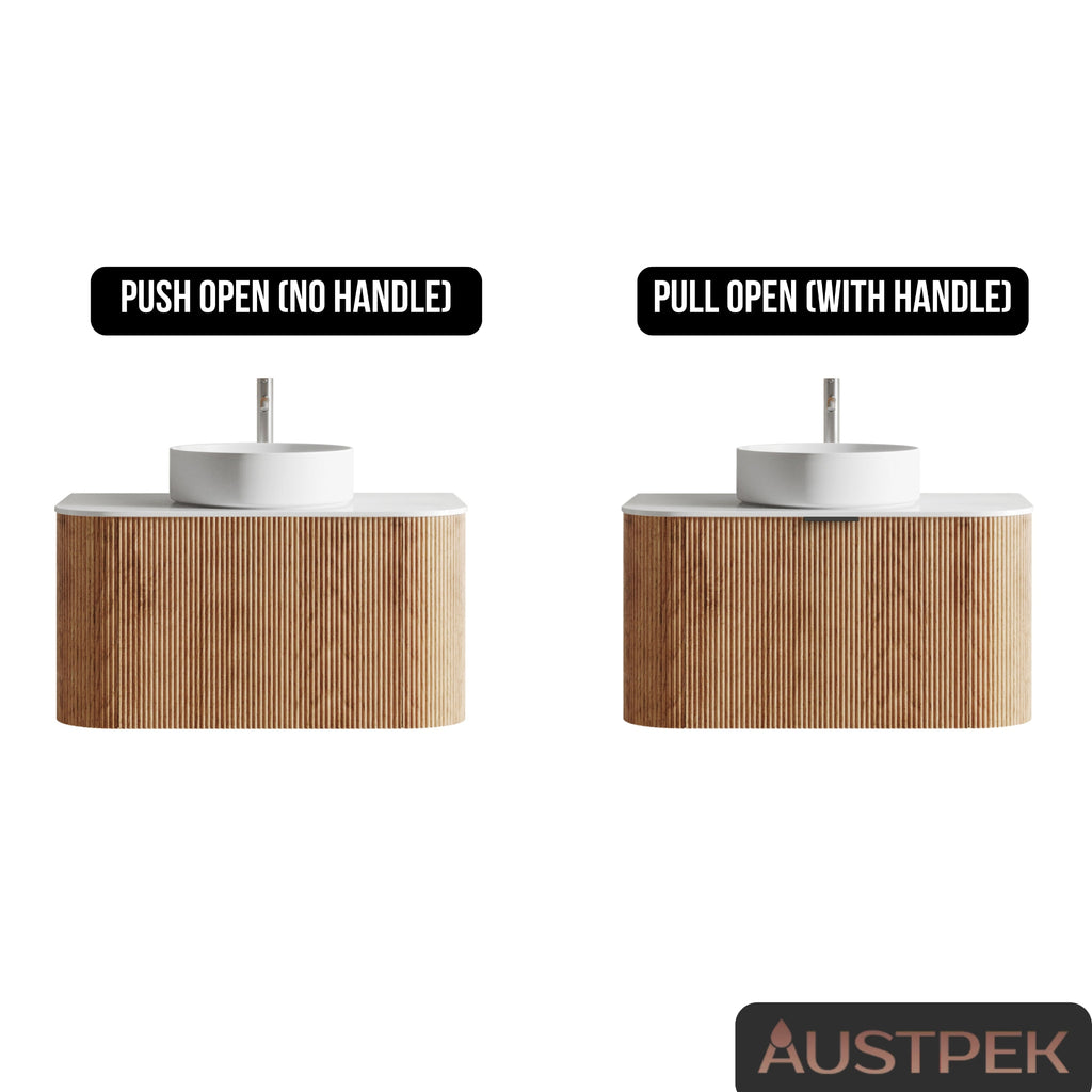 ORIO HAYMAN LIGHT WALNUT FLUTED 900MM CURVE SINGLE BOWL WALL HUNG VANITY