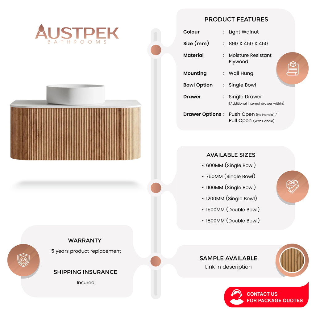 The Orio Hayman Fluted 900mm Curve Single Bowl Wall Hung Vanity, available in light walnut and matte white, blends style with functionality. Made from moisture-resistant plywood, it's ideal for humid bathroom environments. This vanity is designed for compatibility with above counter basins, ensuring a sleek, modern look in any bathroom. Additionally, it comes with a 5-year product replacement warranty, providing long-term assurance and peace of mind for its durability and quality.