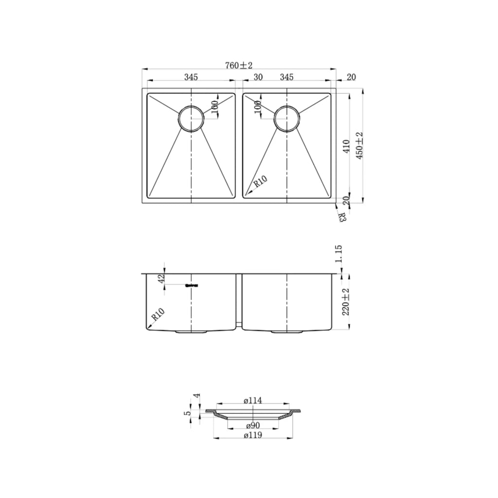 - Overall Sink Size: 760mm X 450mm X 220mm