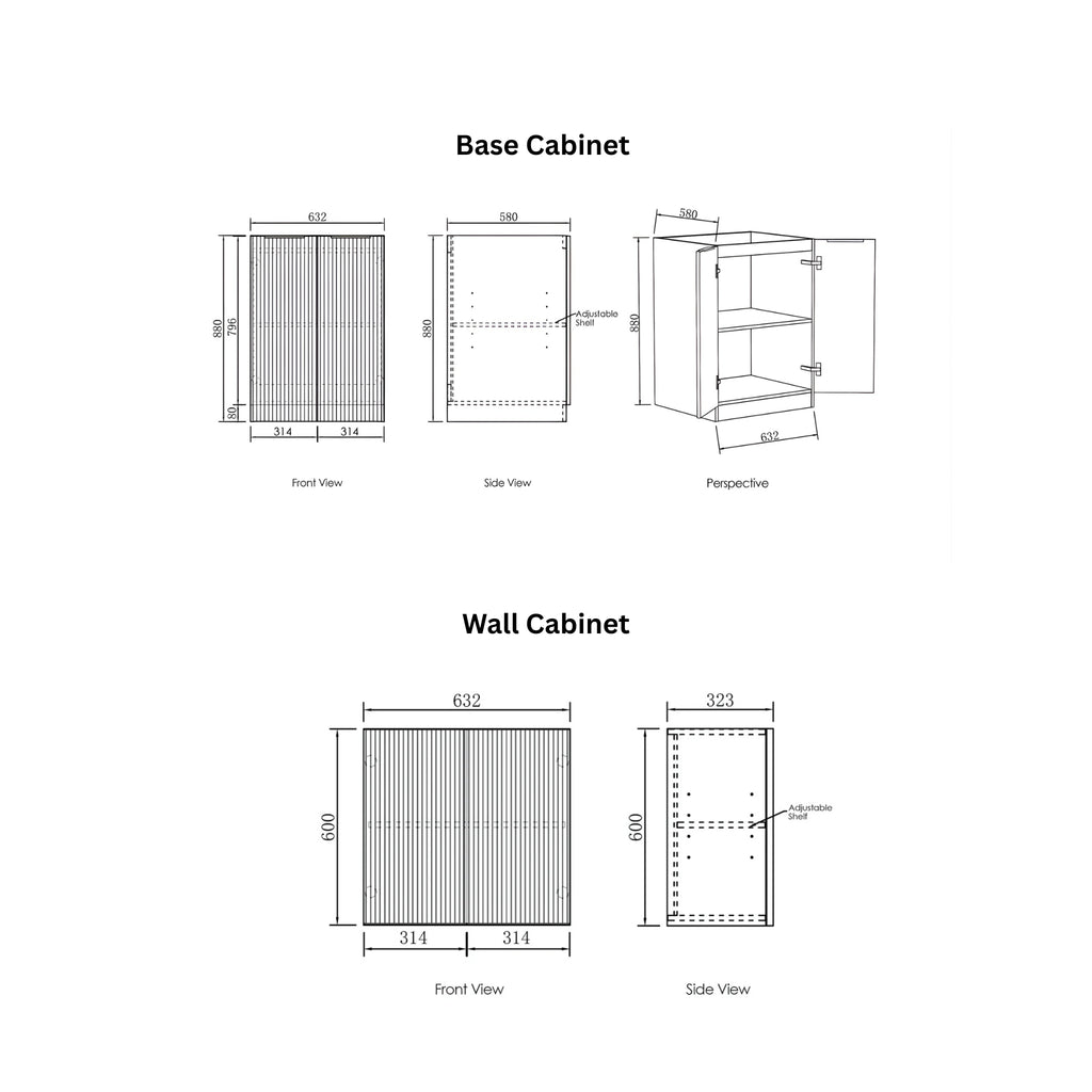 - Cabinet Dimensions: 632mm X 580mm X 880mm (Base Cabinet) | 632mm X 323mm X 600mm (Wall Cabinet)