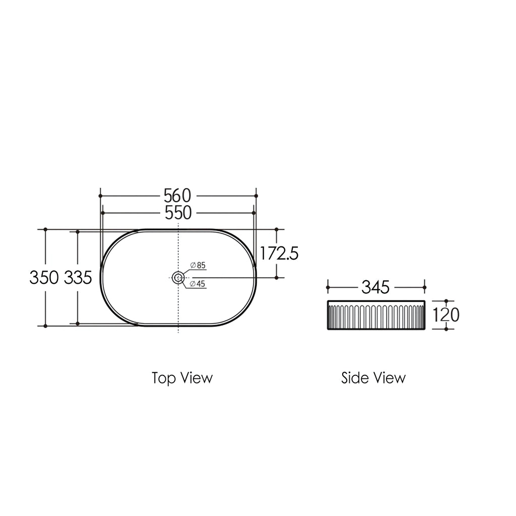 The Otti Kensington Fluted Above Counter Basin Matte Black and White 560mm is a stunning centrepiece for any modern bathroom. Featuring a French fluted detail design, its oval shape combines elegance with functionality. The matte black exterior contrasts beautifully with the matte white Carrara interior, creating a timeless aesthetic. Measuring 560mm x 350mm x 120mm, it is designed for above counter mounting and suits 12 o’clock taphole or wall tapware. Non-overflow style, optional pop-up waste available.