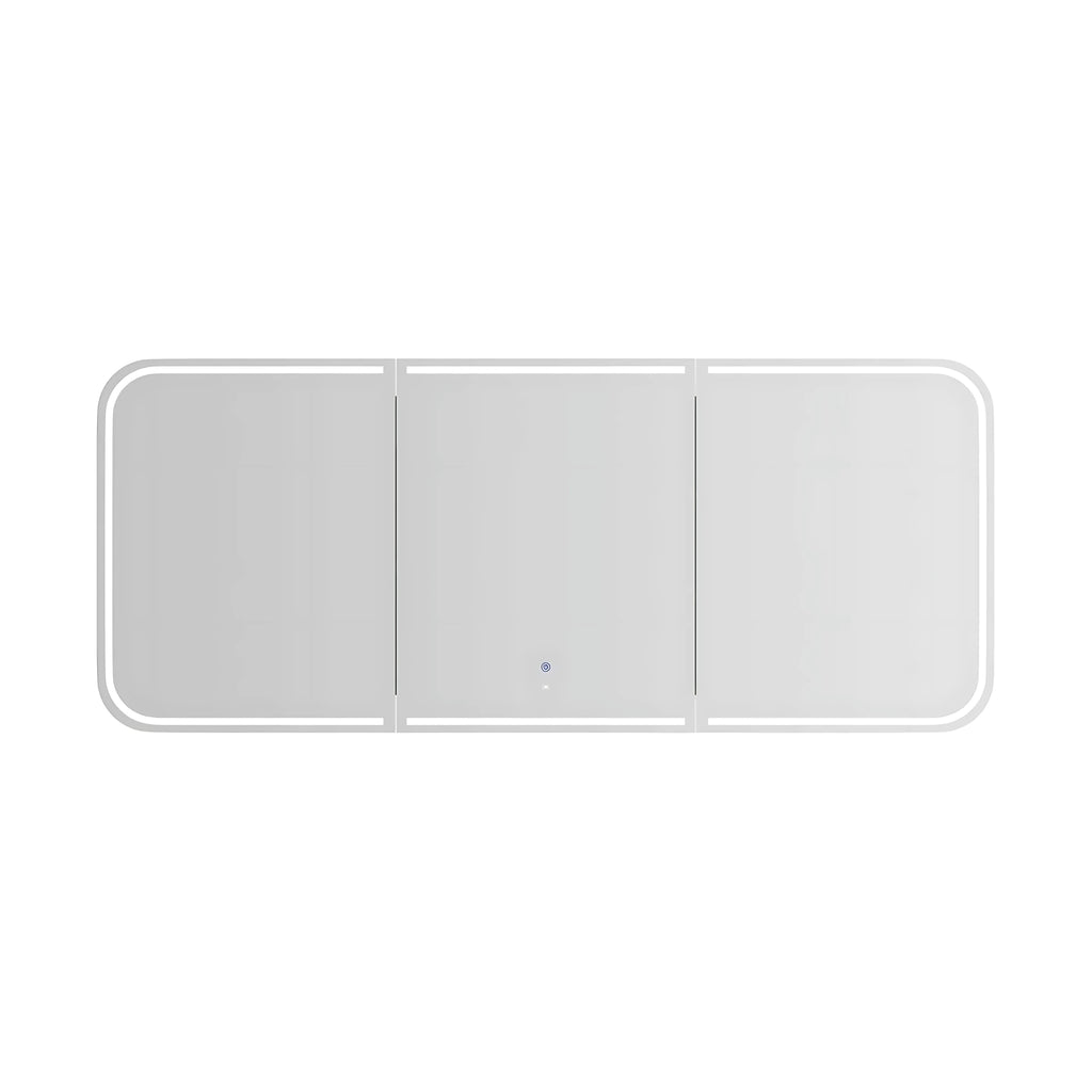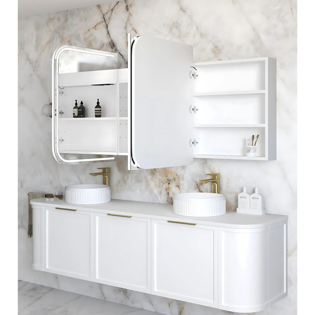 Elevate your bathroom with the Otti Newport Matte White LED Shaving Cabinet with Powerpoint 1800x750mm. Crafted from curved moisture-resistant plywood, it features a sleek matte white finish and 4mm copper-free mirror doors. The three soft-closing doors with fingerpull handles open to adjustable shelving, while integrated Powerpoint, USB, and USB-C ports add convenience. Enjoy versatile lighting with a motion sensor and 3-colour LED options. Wall-mounted design, premium durability, and long-life LED efficiency make it a modern bathroom essential.