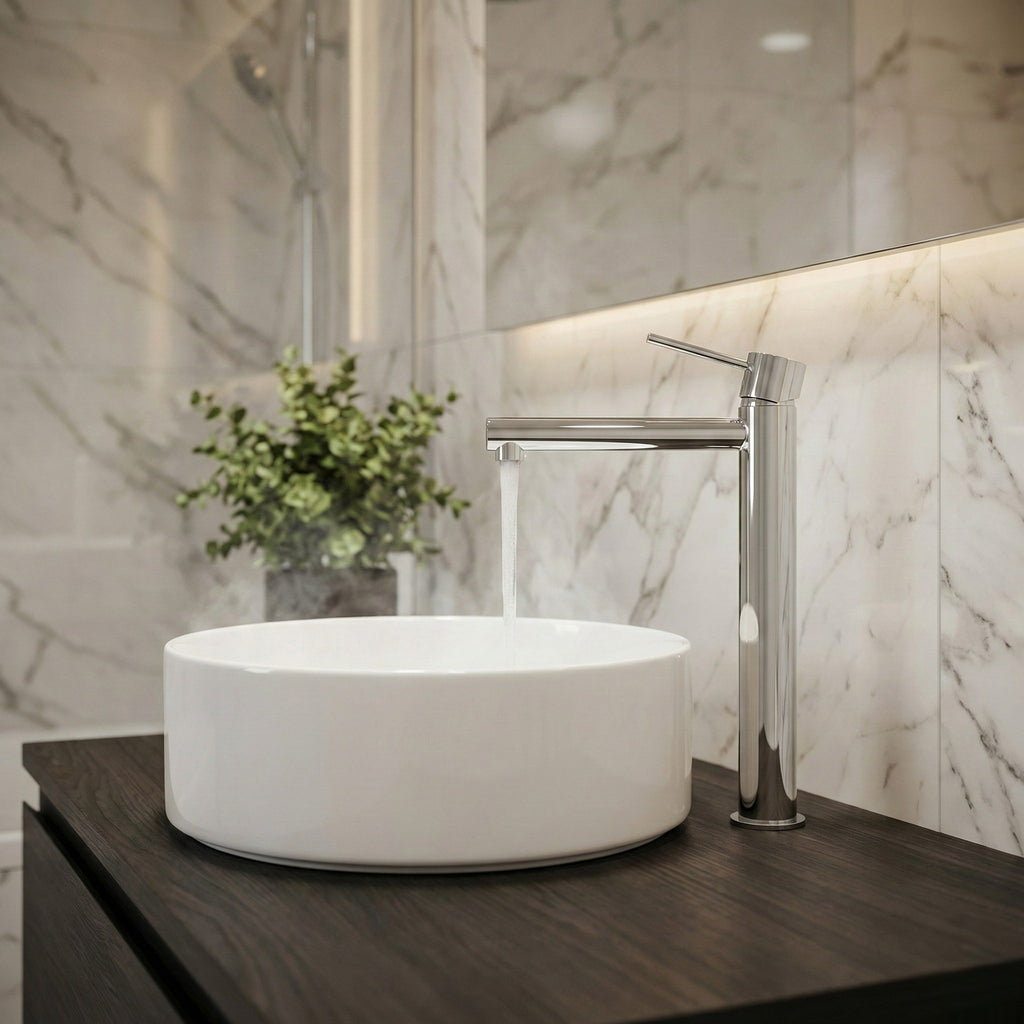 Introducing the Phoenix Vivid Slimline Lead Free Vessel Mixer 289mm in gleaming Chrome, a sleek and stylish addition to your bathroom. Choose from a variety of exquisite colors, including Brushed Nickel, Brushed Gold, Matte Black, and Brushed Carbon, to suit your personal aesthetic. Rest easy with our comprehensive warranty package, which includes a 15-year cartridge warranty, 7-year product or parts warranty, 7-year finish warranty, and 1-year labor warranty. Elevate your bathroom with the Vivid Slimline Vessel Mixer, where elegance meets peace of mind.