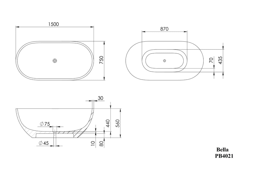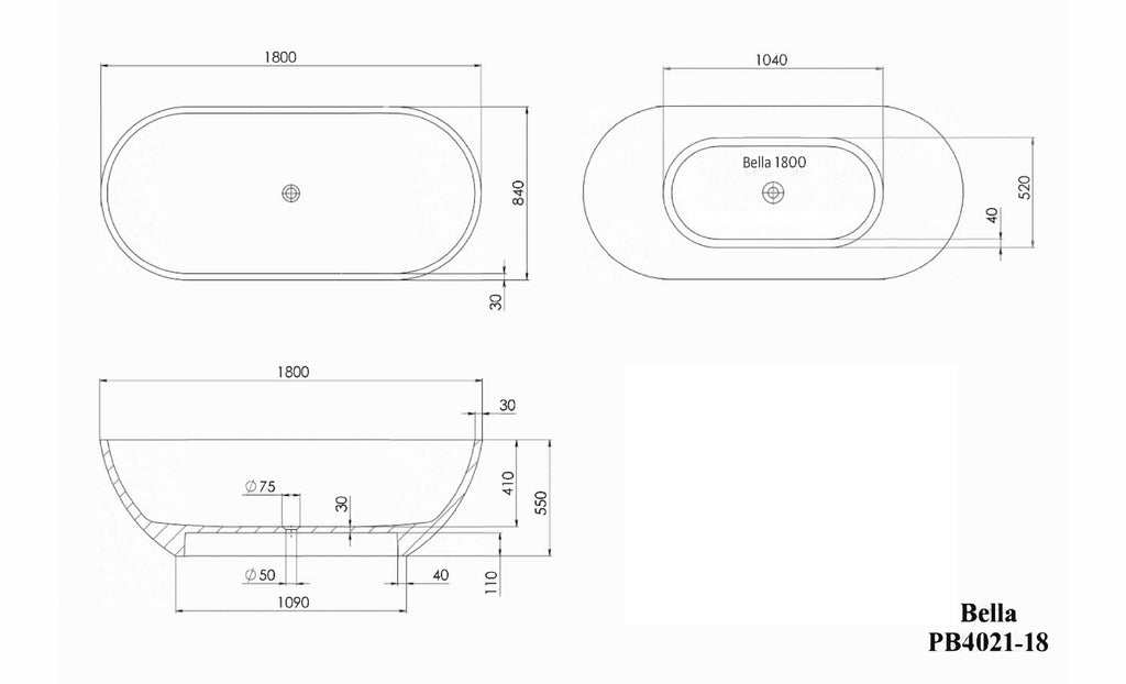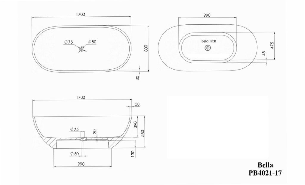 PIETRA BIANCA BELLA MODERN FREESTANDING STONE BATHTUB WITH CUSTOM COLOURS (AVAILABLE IN 1500MM, 1600MM, 1700MM AND 1800MM)