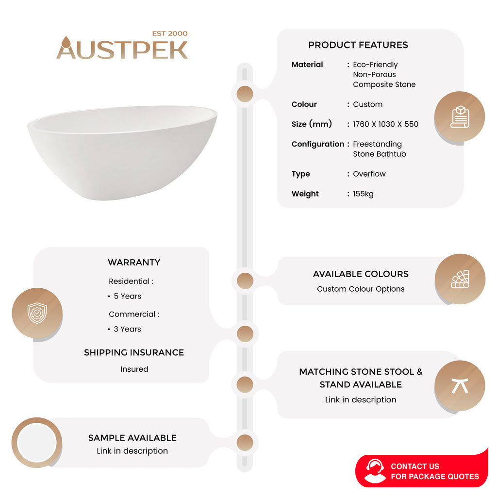 Revitalize your bathroom with the Pietra Bianca Coco Freestanding Stone Bathtub, an exquisite 1760mm centerpiece offering captivating custom colour options. Embrace luxury and functionality in this statement piece, elevating your bathing experience. Backed by a reliable 5-Year Residential Warranty, indulge in both style and durability. Immerse yourself in a haven of relaxation, where sophistication meets assurance, transforming your space into an oasis of opulence and comfort with this timeless, elegant addition.
