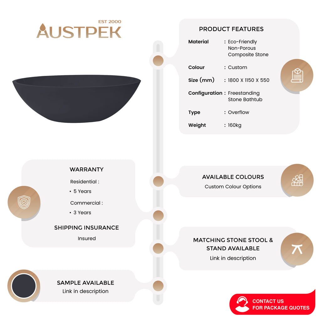 Experience opulence with the Pietra Bianca Maddison Freestanding Stone Bathtub, an exquisite 1800mm centerpiece available in captivating custom color options. Elevate your bath space with this fusion of style and functionality, creating a luxurious sanctuary. Backed by a reassuring 5-Year Residential Warranty, immerse yourself in both elegance and endurance. Embrace the confidence of quality, enhancing your space with this timeless addition that effortlessly combines sophistication and comfort into every rejuvenating soak.
