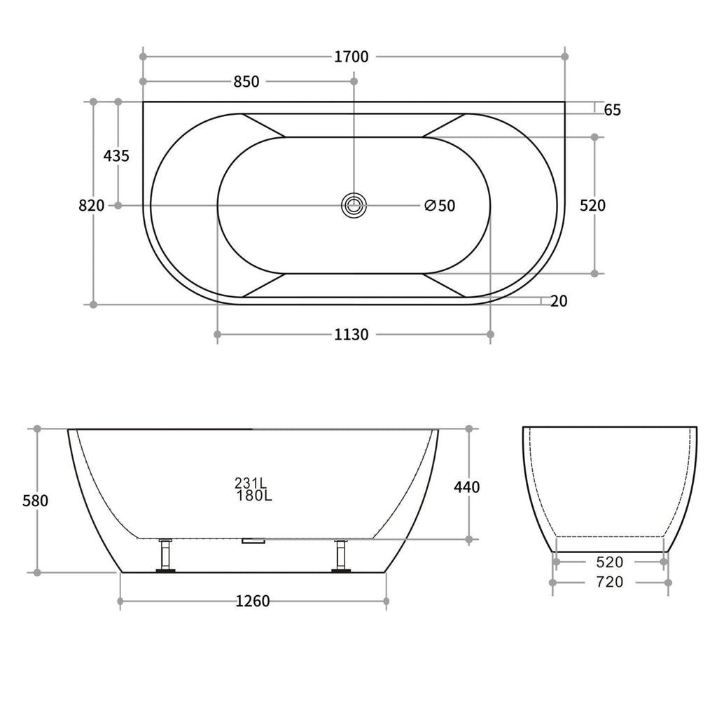 POSEIDON ARIA BACK TO WALL BATHTUB GLOSS WHITE (AVAILABLE IN 1500MM AND 1700MM)
