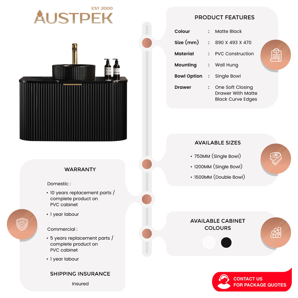 Introducing the Ceto Avalon Matte Black 900mm Single Bowl Wall Hung Vanity, a sleek addition to modern bathroom spaces. Available in Matte White, this vanity redefines sophistication. With a domestic warranty offering 10 years for replacement parts or complete product on the PVC cabinet, plus a 1-year labor guarantee, it promises enduring quality. Elevate your bathroom with this stylish statement piece, where sleek design meets durable craftsmanship, enriching your daily sanctuary effortlessly.