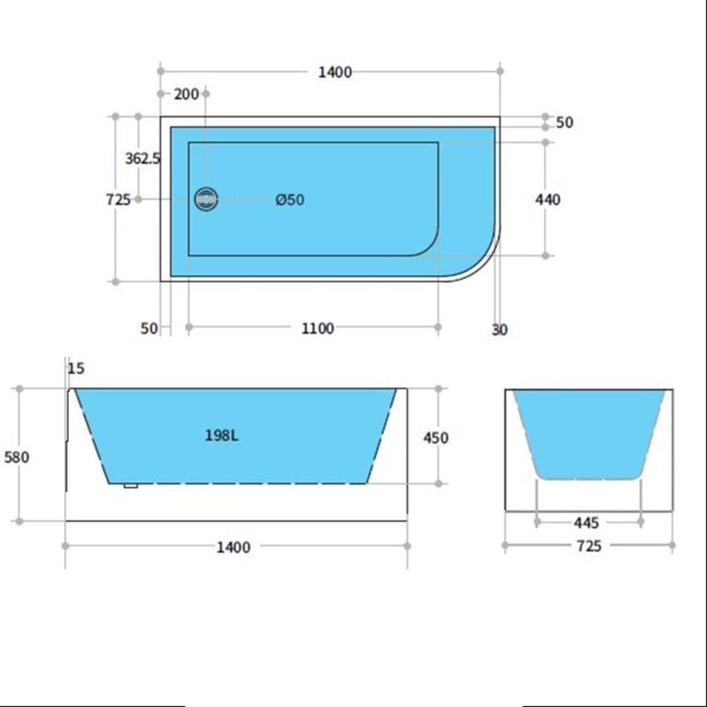 POSEIDON CASEY LEFT CORNER BATHTUB MATTE WHITE (AVAILABLE IN 1400MM, 1500MM AND 1700MM)