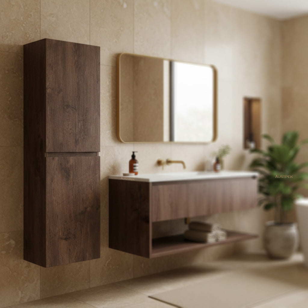 Introduce a touch of class to your bathroom with the Poseidon Tall Boy, a wall-hung unit combining elegance and functionality. Standing at 1350mm and finished in a rich Wood Grain, Dark Oak PVC vacuum filmed on MDF board, this cabinet brings a warm, natural aesthetic. Its robust PVC construction ensures durability. Featuring two doors, it provides spacious and efficient storage. Backed with 10-year warranty on PVC cabinet parts or the complete product and 1-year labor, cherish peace of mind.