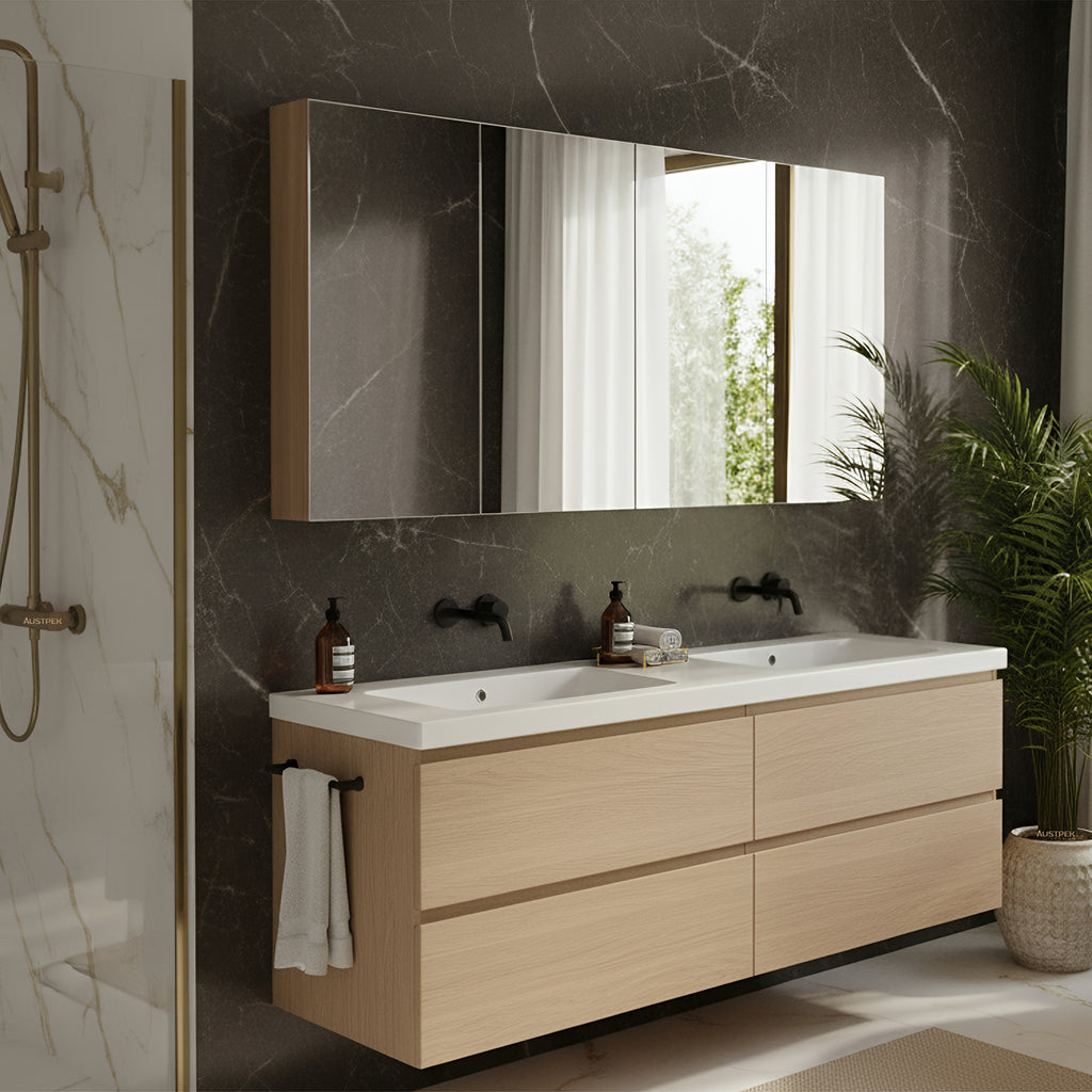 The Poseidon Evie Oak Mirror Shaving Cabinet 1500x750mm features four mirrored doors, offering expansive storage for large bathrooms. Constructed from sturdy MDF and finished in a natural oak look, it blends warm, earthy tones with everyday functionality. Its spacious design provides ample internal shelving, ideal for organising family or shared spaces. Backed by a 1-year replacement parts or complete product warranty and a 1-year labour warranty, it’s a reliable choice for both domestic and commercial bathroom applications.