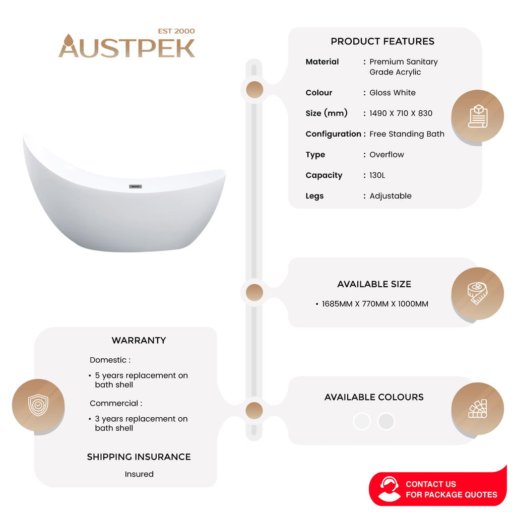 POSEIDON POSH FREE STANDING BATHTUB GLOSS WHITE WITH OVERFLOW (AVAILABLE IN 1500MM AND 1680MM)