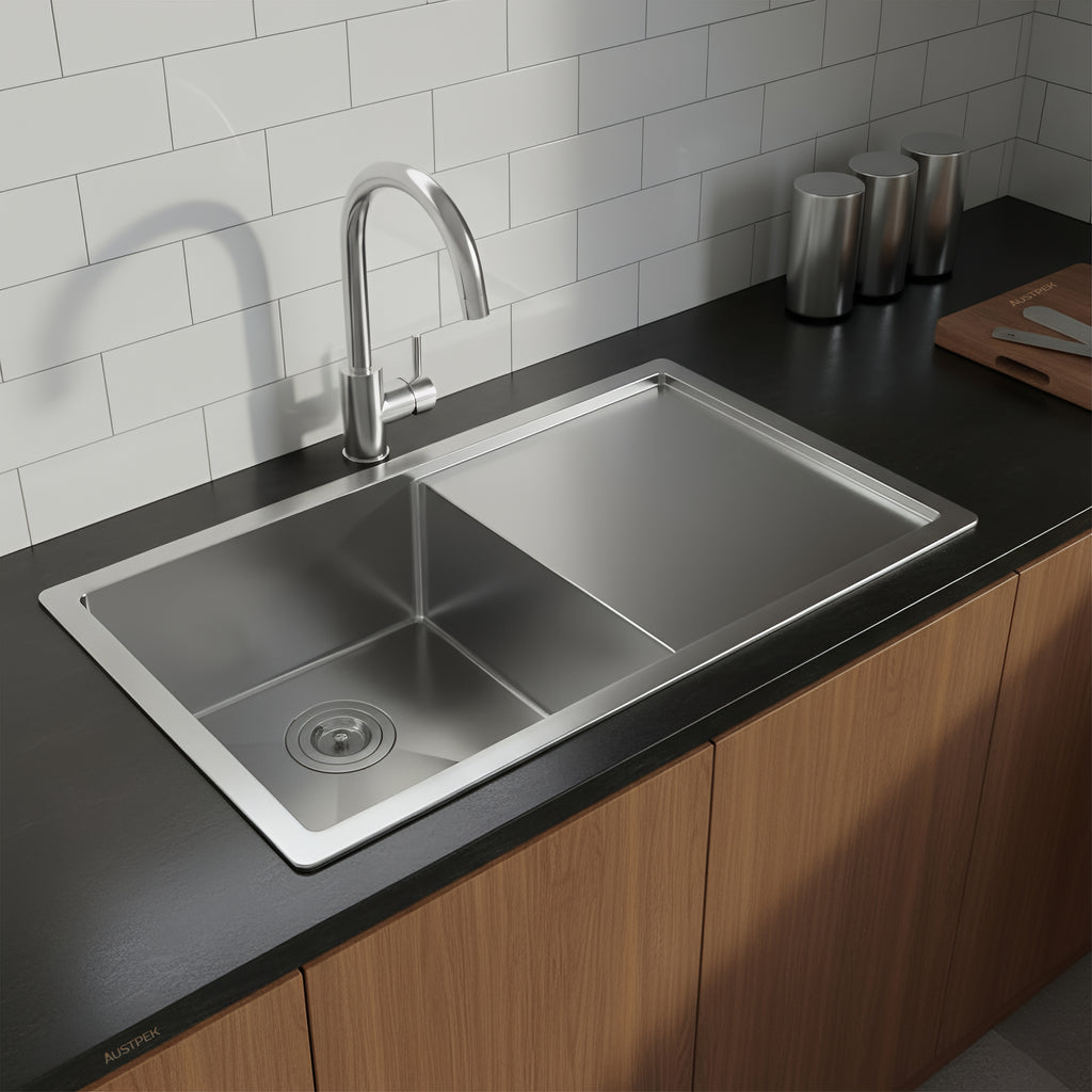 Discover excellence in the Poseidon Hand Made Stainless Steel Kitchen Sink 810mm, where craftsmanship meets sophistication. Crafted with precision, this sink stands out for its impeccable stainless steel design. Available in various sizes, it seamlessly complements your kitchen space. Enjoy peace of mind with a generous 5-year product warranty, ensuring enduring quality. Elevate your kitchen experience with poseidon, where innovation meets reliability, delivering a perfect fusion of contemporary aesthetics and enduring functionality in every detail.
