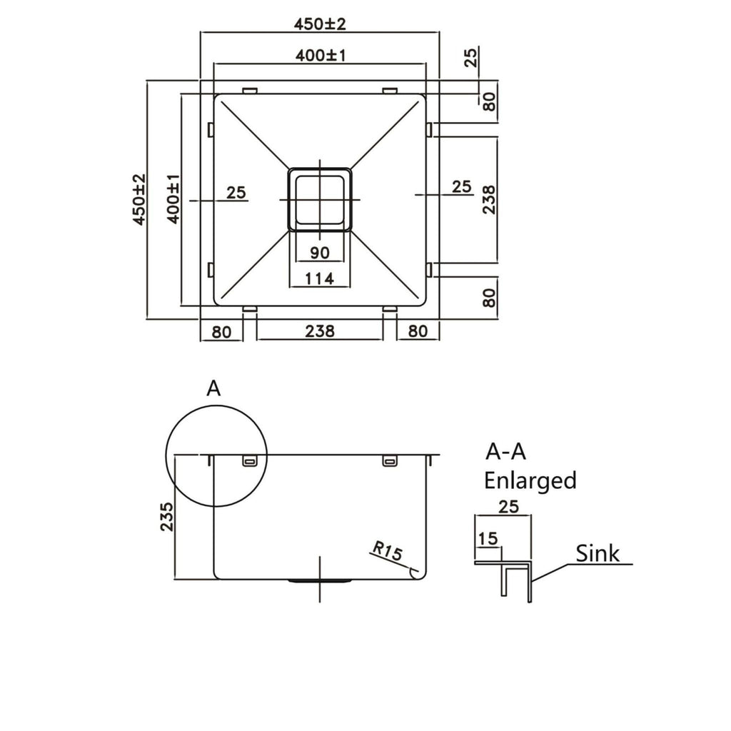 - Overall Sink Size: 450mm X 450mm X 235mm