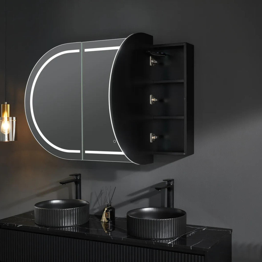 The Poseidon Olivia Matte Black LED Mirror Shaving Cabinet blends innovative lighting with refined design. Crafted from durable PVC with a smooth matte finish, this 1500x800mm oval cabinet features soft-closing double doors and a frameless curved edge. Equipped with a 6000K dimmable cool white LED strip light and inner cabinet illumination, it offers both function and style. IP44 rated and hardwired for reliability, the Olivia includes a 1-year replacement and labour warranty for domestic and commercial use.