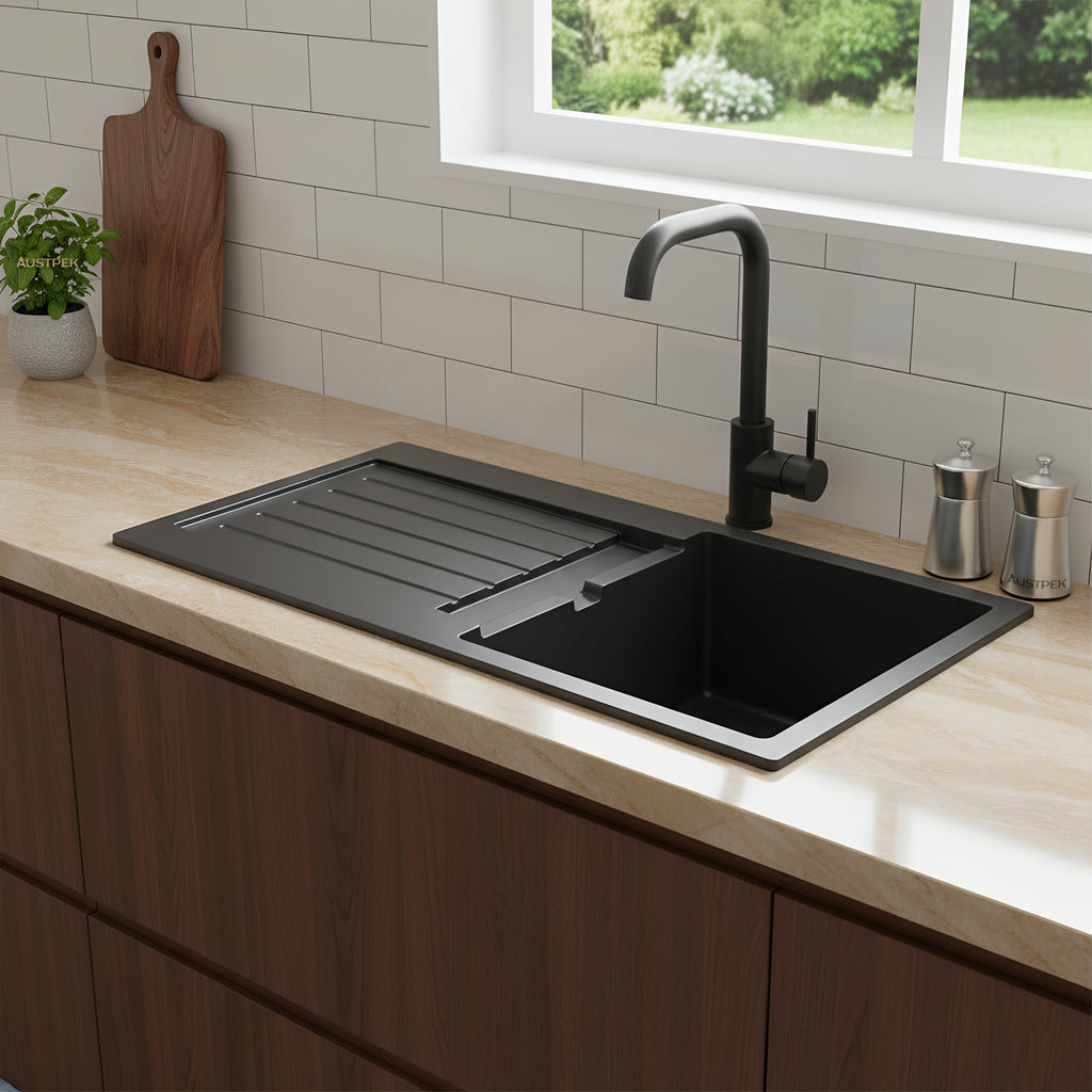 Revamp your bathroom with the Poseidon Quartz Top Mount Kitchen Sink in Matte Black (860mm), a stunning blend of style and functionality. This collection offers flexibility with a variety of colors and sizes to suit your unique taste. Enjoy peace of mind with a 5-year warranty, providing assurance and the option for a replacement sink. Elevate your space with Poseidon where timeless design meets durability, ensuring a statement piece that effortlessly enhances your bathroom aesthetics and withstands the test of time. Redefine elegance with this sophisticated addition.