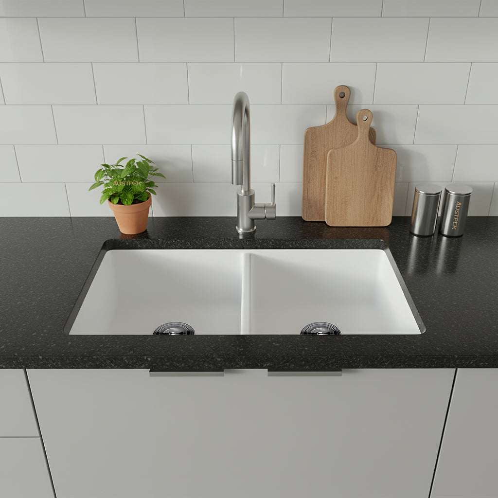 Revitalize your bathroom with the Poseidon Quartz Undermount Kitchen Sink in Matte White (838mm), a sublime fusion of style and utility. This collection, also available in matte black and matte grey, allows you to customize your space effortlessly. With a 5-year warranty offering peace of mind and a replacement sink option, Poseidon guarantees both durability and sophistication. Redefine your bathroom aesthetics with a statement piece that effortlessly complements your style while enduring the test of time. Elevate your space with Poseidon the epitome of elegance and functionality.