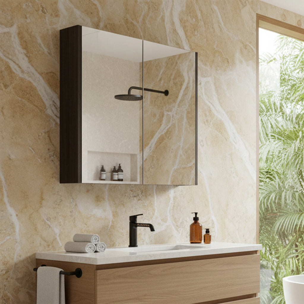 The Poseidon Qubist Dark Grey Mirror Shaving Cabinet 600x720mm adds a bold, contemporary touch to any bathroom. Made from high-density MDF board with a durable dark grey PVC film finish, it features double mirrored doors for practical use and sleek style. Ideal for compact spaces, it offers discreet storage without compromising on design. Backed by a 1-year replacement parts or complete product warranty and a 1-year labour warranty, it’s suited to both domestic and commercial environments.