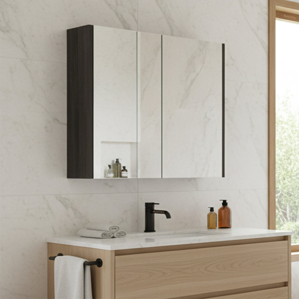 The Poseidon Qubist Dark Grey Mirror Shaving Cabinet 900x720mm offers generous storage with a contemporary edge. Made from high-density MDF board and finished in a stylish dark grey PVC film, it features double mirrored doors that provide both function and refined aesthetics. Perfect for larger bathroom spaces, it keeps essentials organised while complementing modern interiors. Backed by a 1-year replacement parts or complete product warranty and a 1-year labour warranty, it’s designed for reliable domestic and commercial use.