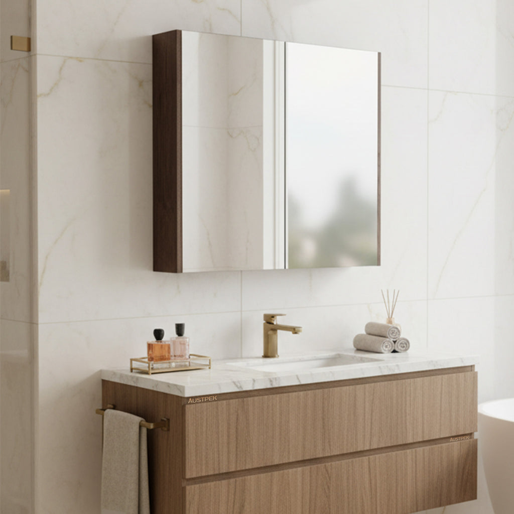 The Poseidon Qubist Dark Oak Mirror Shaving Cabinet 600x720mm brings warm, natural tones to your bathroom with its dark oak PVC film finish on high-density MDF board. Featuring double mirrored doors, it offers compact storage and everyday functionality in a stylish design. Ideal for smaller spaces, it suits both contemporary and classic interiors. Supported by a 1-year replacement parts or complete product warranty and a 1-year labour warranty, it’s a dependable choice for domestic and commercial applications.