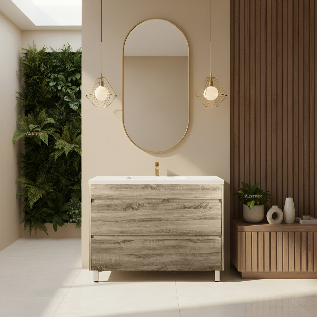 Revitalize your bathroom with the Poseidon Floor Standing Vanity, elegantly crafted in White Oak and spanning a generous 1200mm. Also available in sizes 600mm, 750mm and 900mm , it’s tailored to fit diverse spaces. This masterpiece boasts Soft Closing Double Drawers, an Optional Pop-Up Waste, and is set upon a radiant White Oak Wood Grain PVC Vacuum Filmed MDF Board. With optional tops and basins, customize to your desire. Its robust PVC construction comes with a comprehensive warranty, ensuring timeless allure.