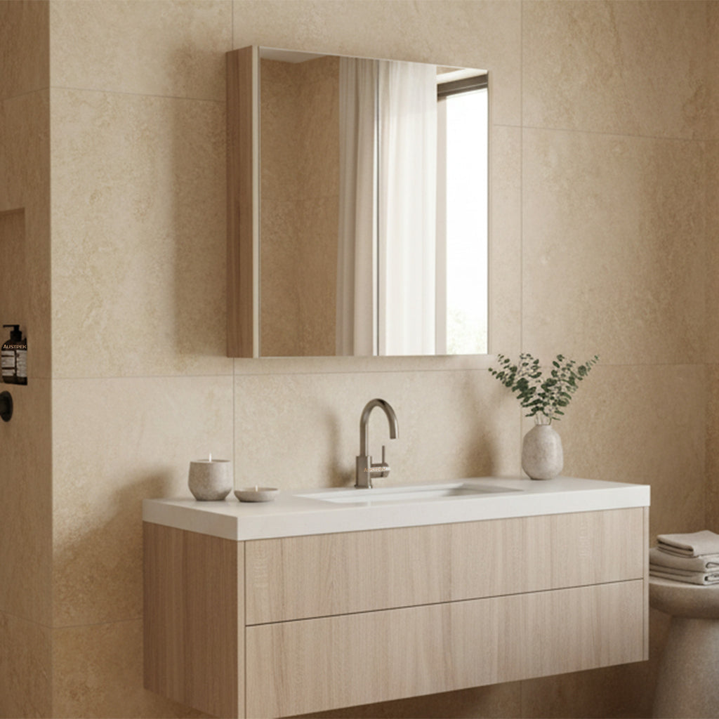 The Poseidon Qubist White Oak Mirror Shaving Cabinet 600x720mm features a sleek design with double doors, crafted from high-density MDF board and finished in a durable white oak PVC film. Perfect for modern bathrooms, this cabinet offers concealed storage while doubling as a functional mirror. Designed for durability and style, it’s backed by a 1-year replacement parts or product warranty and 1-year labour warranty for both domestic and commercial applications, providing peace of mind and long-lasting performance.