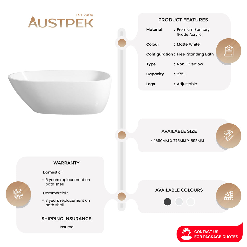 POSEIDON VEDA FREE STANDING BATHTUB MATTE WHITE 1690MM