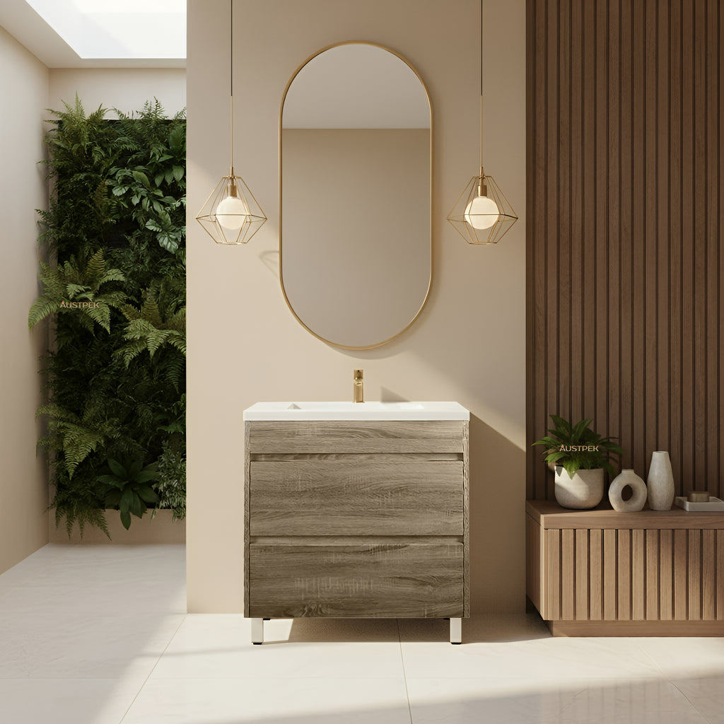 Discover the sophistication of the Poseidon Floor Standing Vanity. In an elegant White Oak finish and a versatile 750mm size, with other size options spanning from 600mm, 900mm and 1200mm. This vanity boasts Soft Closing Double Drawers and an optional Pop-Up Waste, while the exquisite White Oak Wood Grain PVC Vacuum Filmed MDF Board radiates luxury. Complete your vanity by selecting from optional tops and basins. Benefit from durable PVC construction and an extensive warranty.
