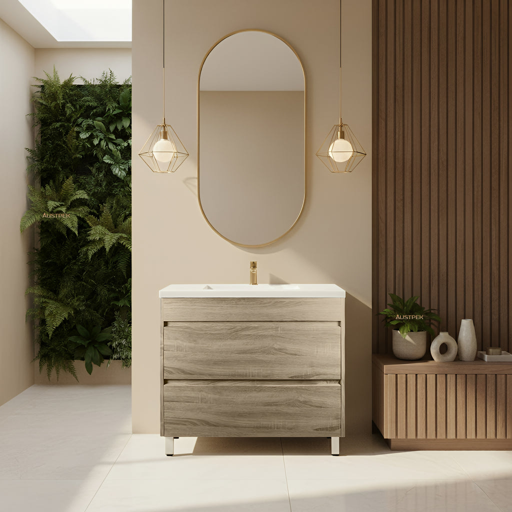 Elevate your bathroom's aesthetics with the Poseidon Floor Standing Vanity. Crafted in a stunning White Oak finish at a spacious 900mm size, it's also adaptable with sizes ranging 600mm, 750mm and 1200mm. Features like Soft Closing Double Drawers, Optional Pop-Up Waste, and the rich White Oak Wood Grain PVC Vacuum Filmed MDF Board emphasize its luxurious design. Customize with optional tops and basins. Enjoy durable PVC craftsmanship and a comprehensive warranty.