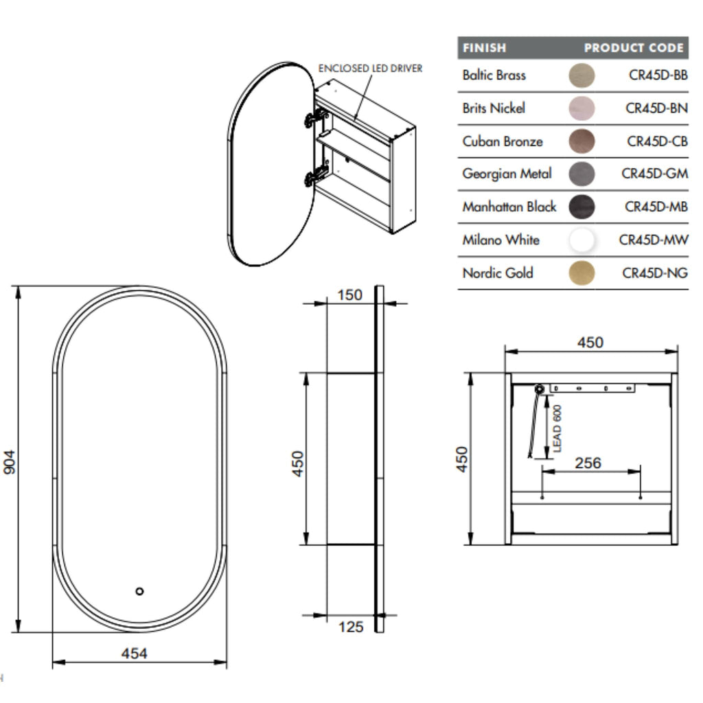 REMER CAPSULE CUSTOM COLOURS FRAMED WHITE LED SHAVING CABINET 454X904MM