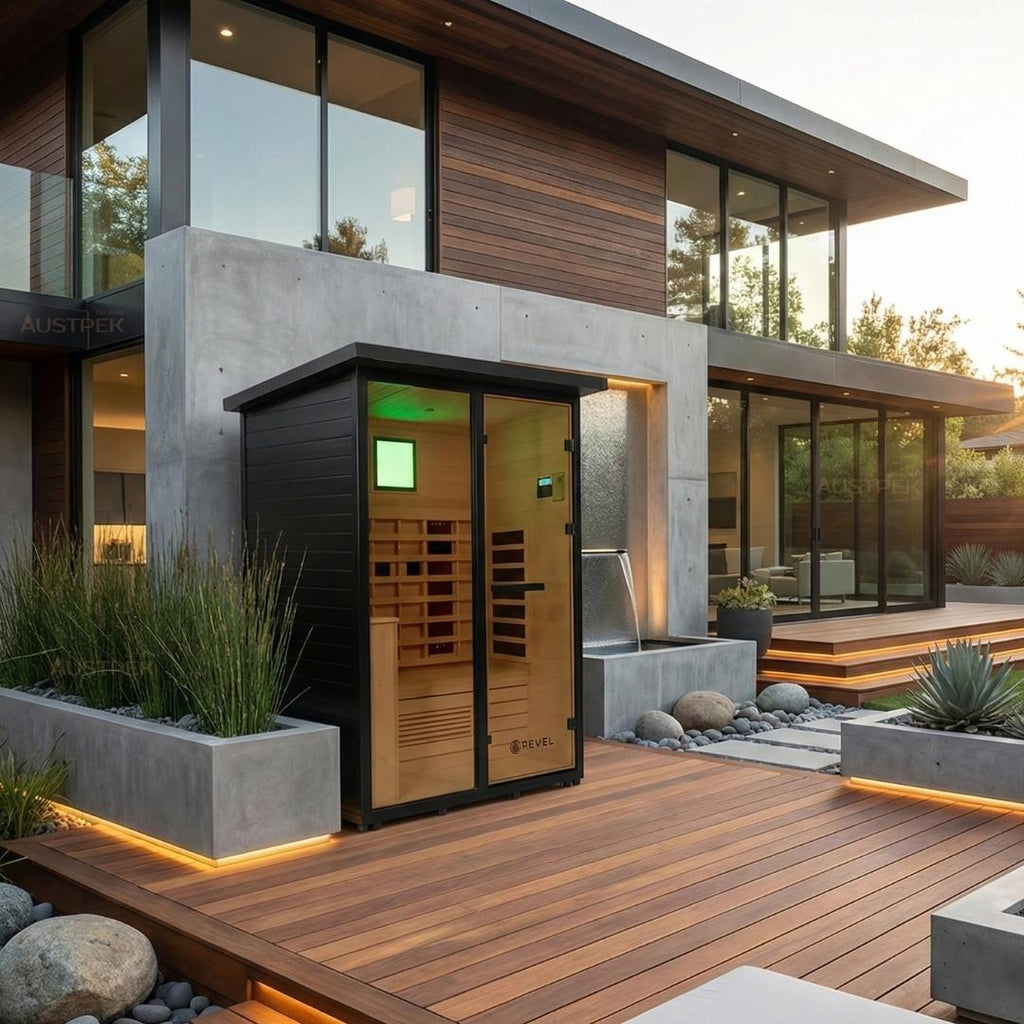 The Revel Eclipse 2 Person Full Spectrum Low EMF Infrared Cabin Sauna offers targeted full-body recovery with four full-spectrum and two ultra-low EMF carbon heaters. Combining near, mid, and far infrared wavelengths, it delivers balanced detoxification, pain relief, and relaxation. Built with a sleek WPC exterior for Australian conditions and a Canadian Hemlock interior for comfort and durability, it suits indoor or outdoor use. Features include chromotherapy lighting, Bluetooth control, and German-engineered speakers. Backed by a 5-year cabin warranty.