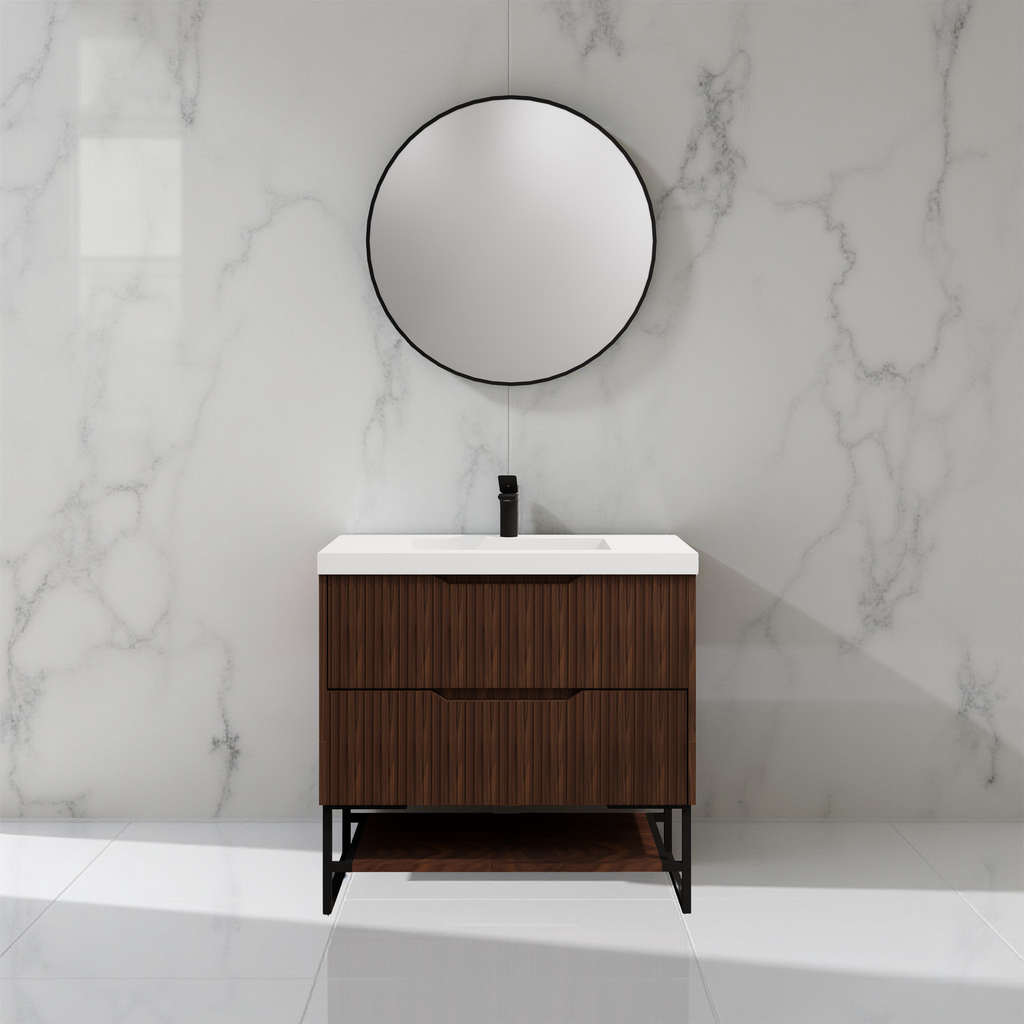 The Riva Bali Brown Oak 900mm Single Bowl Floor Standing Vanity is made from high-quality MR Melamine Board Panel with a durable PVC coating. Ideal for modern bathrooms, it provides generous storage space and a stylish design. This vanity comes with a 10-year warranty on replacement parts or the complete product, and a 1-year labor warranty, ensuring long-term satisfaction and reliability. Enhance your bathroom with this functional and elegant vanity.