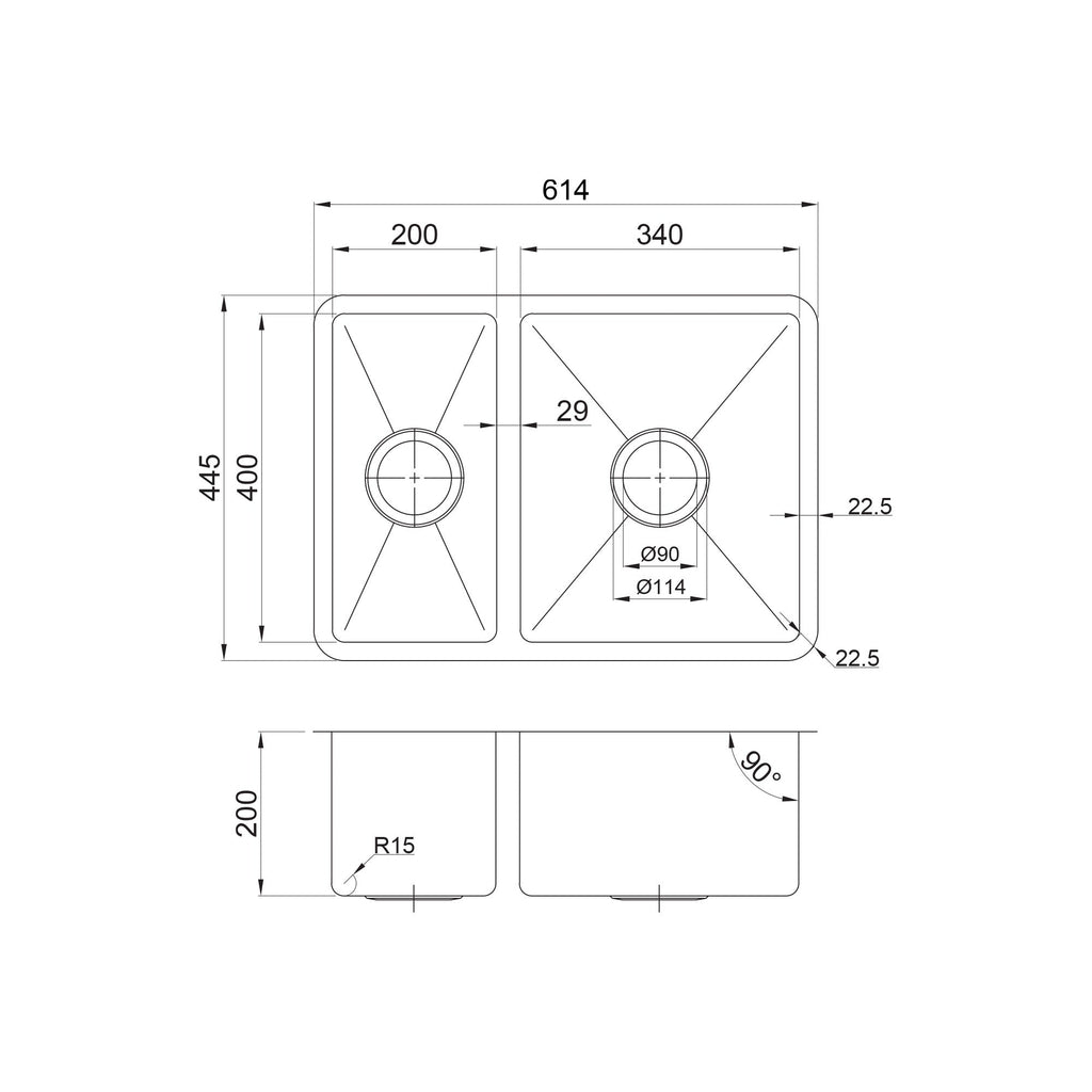 - Overall Sink Size: 614mm X 445mm X 200mm
