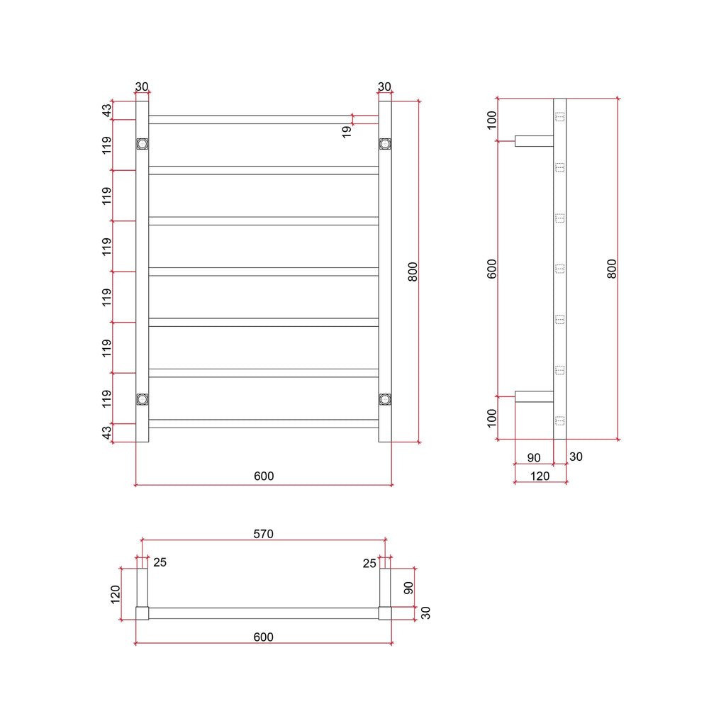 THERMOGROUP 7-BAR SQUARE LADDER HEATED TOWEL RAIL POLISHED STAINLESS STEEL 600MM