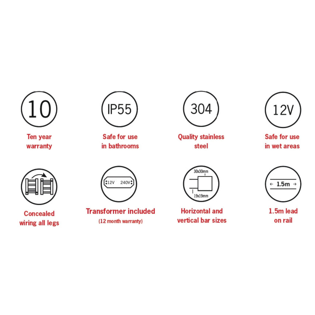 The Thermogroup 7-Bar Square Ladder Heated Towel Rail, 600mm, features a polished stainless steel finish for a sleek and modern bathroom look. Designed for efficient heating, it ensures towels are warm and dry, with flexible installation options for convenience. Crafted from durable materials, it combines style and functionality. Warranty: 10-year replacement warranty covering the finish, rail body, and element, ensuring long-lasting performance and peace of mind. Perfect for enhancing bathroom comfort and elegance.