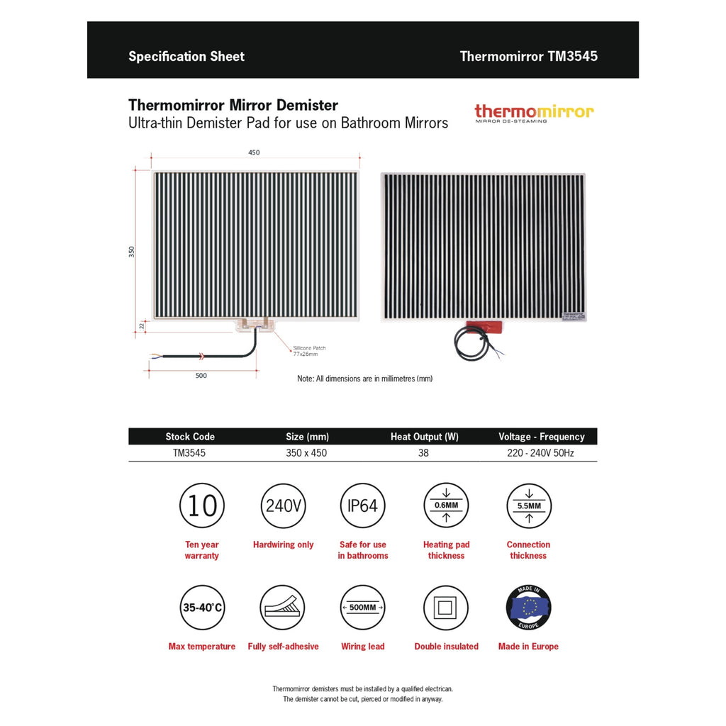 Enhance your bathroom with the Thermogroup Ablaze Arch White Framed Mirror with Demister 800MM. Featuring a sleek white powder-coated aluminium frame, this elegantly designed arch-shaped mirror is perfect for portrait mounting. The frameless, non-LED style ensures timeless appeal, while the 4mm silver mirror adds clarity. The integrated demister requires hard-wiring to a standard switch by a qualified electrician, ensuring fog-free convenience. Measuring 500mm x 800mm x 20mm, it includes a 2-year replacement warranty for peace of mind.