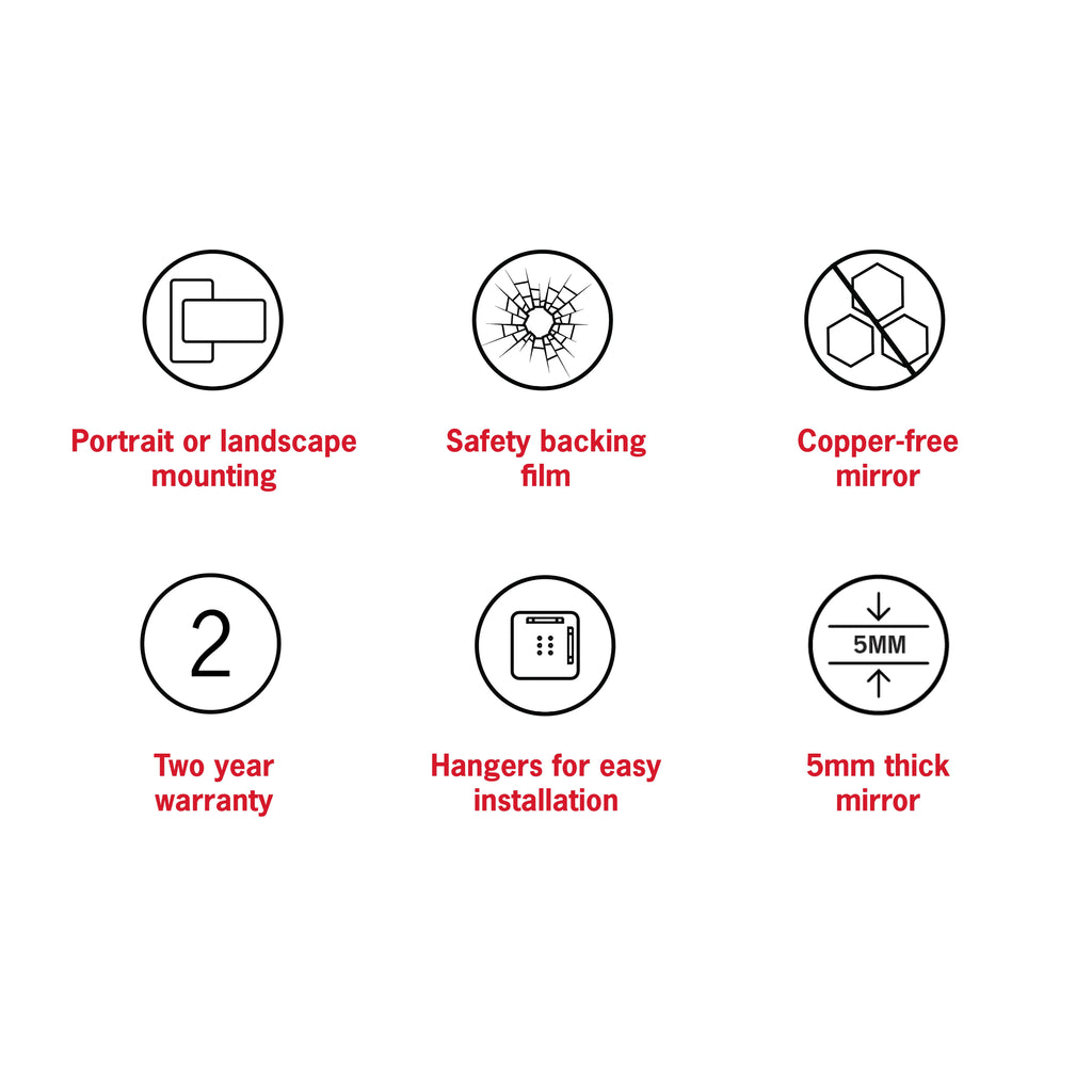 This elegant pill-shaped mirror features a polished edge and comes with metal hangers for easy mounting. Made from high-quality silver mirror with a 14mm thickness, it can be mounted in both landscape and portrait orientations. Ideal for enhancing the look of any space, it offers a stylish and functional design. The mirror is equipped with a demister, ensuring fog-free use in bathrooms or other humid environments. Backed by a 2-year replacement warranty for peace of mind.